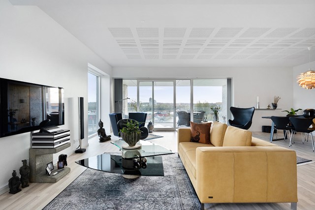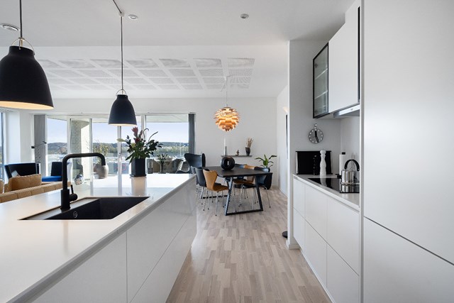 Til slut møder I et stort, åbent opholdsrum med direkte forbindelse mellem køkken og stue. Her er indrettet med alt fra et stilrent køkken til akustikplader og en lang række brede vinduespartier, der lukker lyset ind og samtidig indrammer den smukke udsigt.
