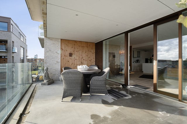 Fra stuen har I adgang til det ene af to solrige uderum, og denne store udsigtsterrasse giver jer et overdækket uderum med spots i loftet og adgang til et skur.