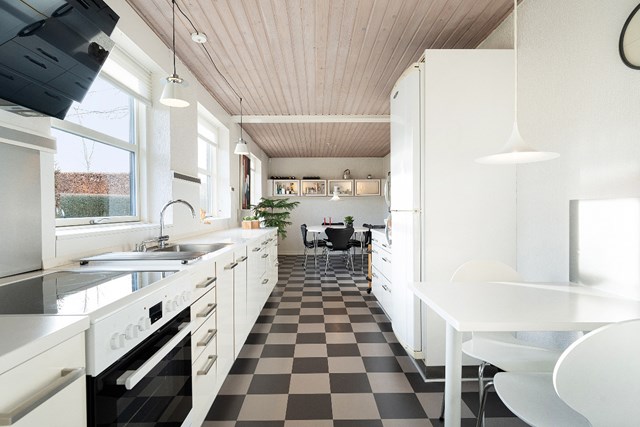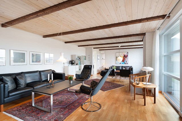 Et skønt lysindfald og blotlagte loftsbjælker bliver den gennemgående røde tråd for hjemmet, og så sørger det opdaterede inventar i køkkenet og på de to badeværelser for, at hverdagen kommer til at fungere gnidningsfrit.