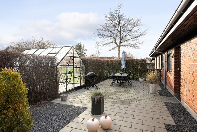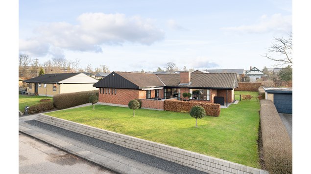 I forlængelse heraf ses den vedligeholdelsesvenlige plæne med robotplæneklipper, den praktiske garage samt de omkransende terrasser, hvorfra I kan til- og fravælge sol og skygge alt efter behov.