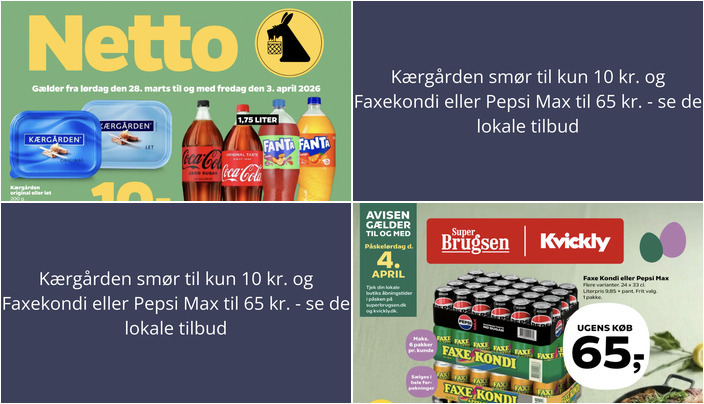 SuperBrugsen har et godt tilbud på Faxekondi eller Pepsi Max, hvor du kan få en pakke med 24 x 33 cl. til kun 65 kr. pr. pakke. Der er en begrænsning på maks. 6 pakker pr. kunde. Tilbuddet gælder fra fredag den 27. marts til lørdag den 4. april.