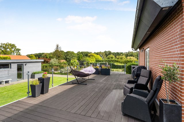 Senest blev den ene terrasse med direkte udgang fra køkken-alrum etableret i 2020 med sol fra morgen til aften, mens havens kæmpestore terrasse giver rigelig plads til sommerens selskaber og samtidig en skøn udsigt til den grønne natur. Heromme i de ugenerede arealer findes desuden et tidligere due- og hønsehus, der i dag fungerer som værksted. Det er tilmed isoleret.