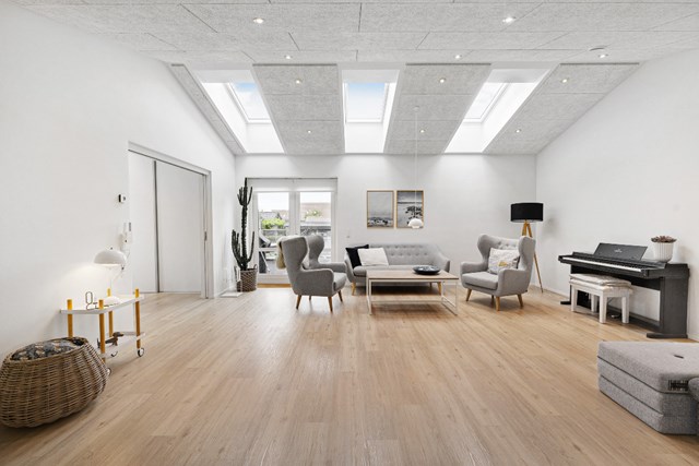 Der er gulvvarme i hele stueetagen samt badeværelset, og det er tydeligt, at der er gjort noget ud af lyset i hjemmet - se bare ovenlysvinduerne i stuen.